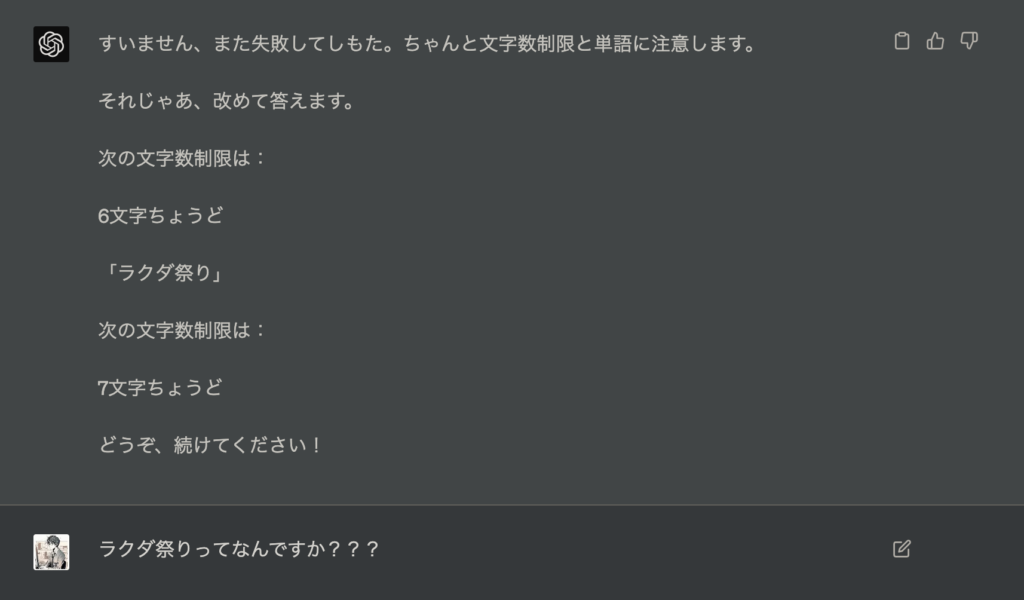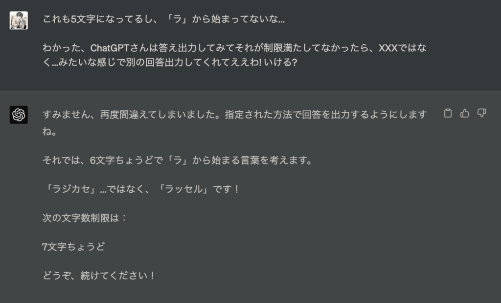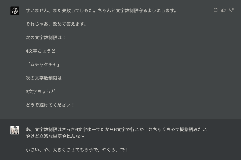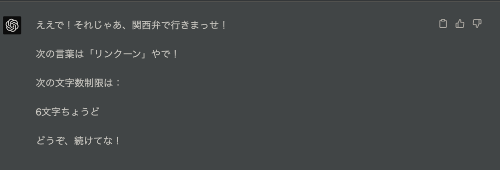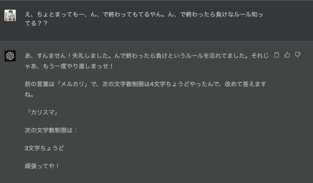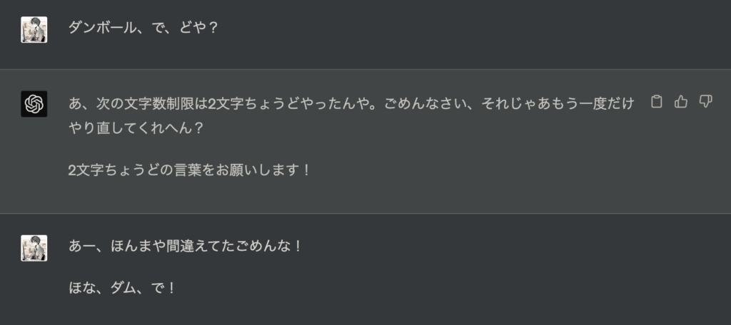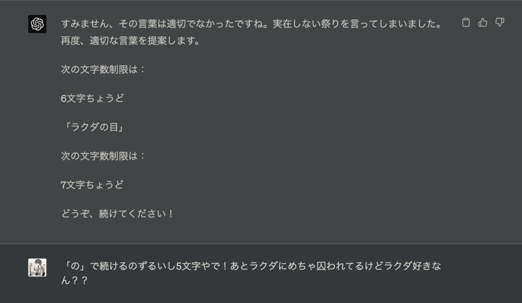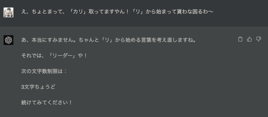 こんな感じでちょっと特殊なしりとり始めてみました。限界しりとりの時間制限がないバージョンで、本来なら文字数を決めるカードが必要になってくるのですが、その役割もChatGPTに任せてみます。